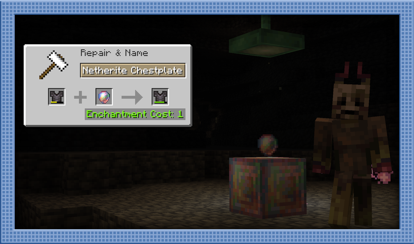 The Atoning Table is a more cursed version of enchanting tables. Enchanting tools at the Atoning Table costs durability instead of experience. The three levels correspond to risk and reward - choosing a riskier option will net you better enchantments but cost you more durability! Atoning costs both Spinel and Lapis. Atoning Tables have a custom UI, as well as an entirely new alphabet that is used for the text in the GUI and the letters surrounding the table!