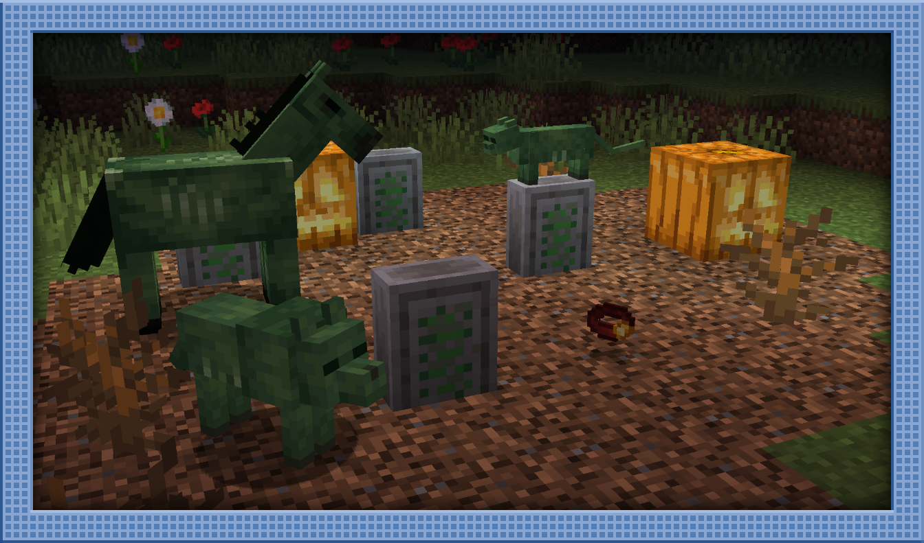 Old showcase on Zombie Wolves, Cats, and Horses. Gravestones have since been replaced with a new mechanic for reviving.